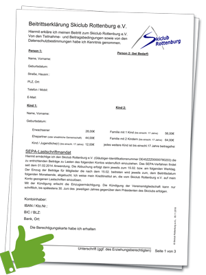 Hinweise zur Beitrittserklärung: Die Skiclub Beitrittserklärung kannst du gleich am PC ausfüllen, ausdrucken, bitte alle drei Seiten unterschreiben und im Büro der Geschäftsstelle des Skiclub Rottenburg e. V. abgeben. Dort erhältst du auch deinen Mitgliedsausweis. Ein handschriftliches Ausfüllen ist am ausgedruckten Formular natürlich auch möglich 😉